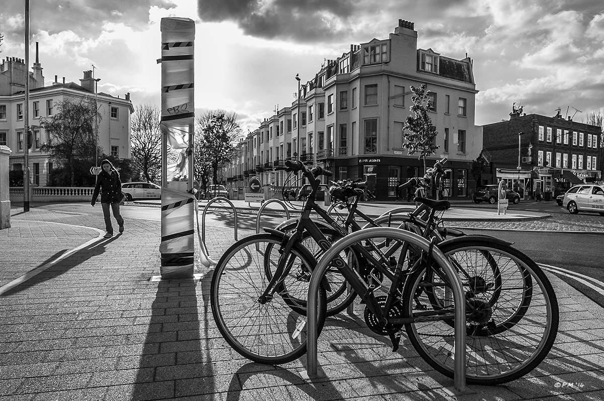 Seven Dials Roundabout new development with bicycle rack in foreground, dramatic clouds and long shadows towards viewer from sunlight. Street Photography Brighton UK. Monochrome Landscape. © P. Maton 2014 eyeteeth.net