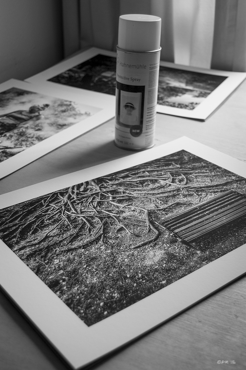 Monochrome prints on Museum Etching paper on desk next to can of Hahnemühle Protective Spray. Monochrome Portrait. © P. Maton 2015 eyeteeth.net