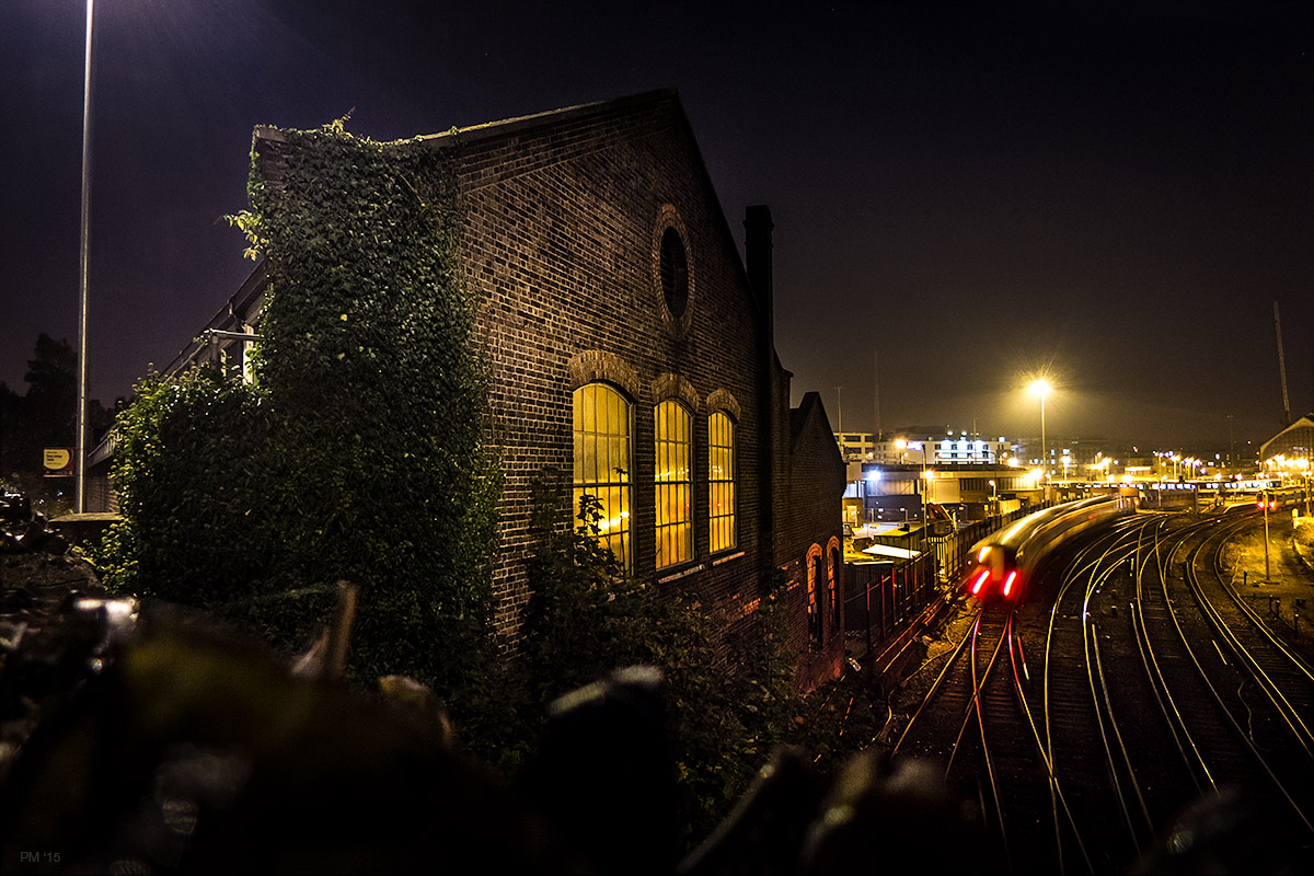 Thank you Tim. The light is what I noticed first and then as I walked passed (I frequently do) the windows caught the lights from the distant station and I was compelled to try and frame a shot. The light hitting the building wall is from another street lamp out of shot off to the left shining between some trees.